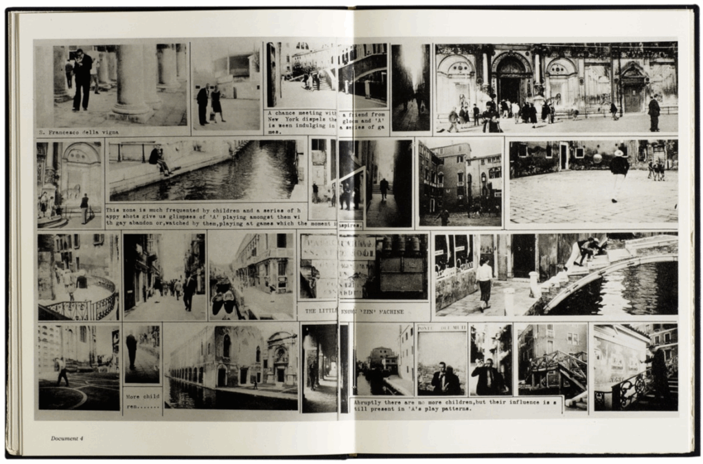 When your dérive is over, you may make something that describes your movements and impressions in a similarly disorganized way. The few reports of Situationist dérive are similar to Baudelaire’s writing on the flâneur in that they expresses an atmosphere without reducing it to an argument or thesis statement. Debord’s map collage (at the top of this page) is one example of a dérive-related artwork; another is Ralph Rumney’s 1957 volume, The Leaning Tower of Venice, a page opening of which is pictured below.