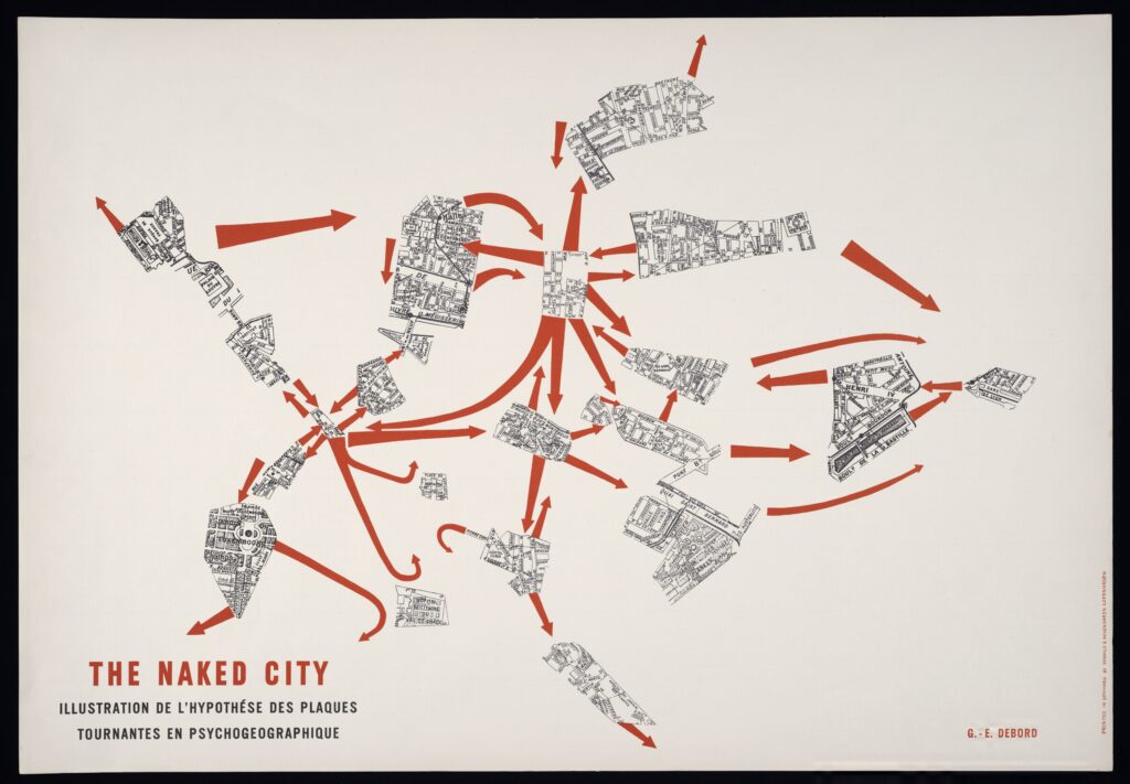 More wandering: In the 1950s, the French artist and critic Guy Debord (1931-1994) and a group called the Situationists drew on Benjamin, Baudelaire, and others to develop a type of urban wandering they called dérive. In “Theory of the Dérive” (1958), Debord called it “a technique of rapid passage through urban ambiances.” His guidelines for conducting a dérive reads almost like the opposite of last week’s guide to “having an experience”: the activity is best done in a group, with no particular goal or point of focus in mind. He writes: